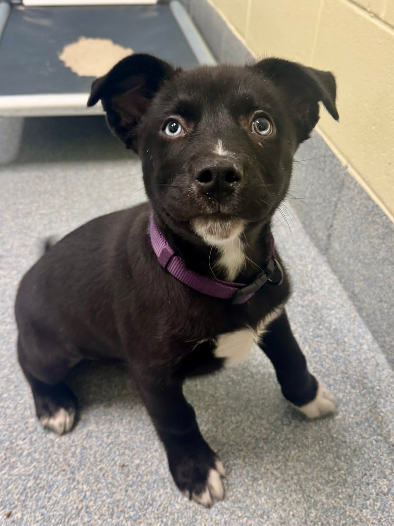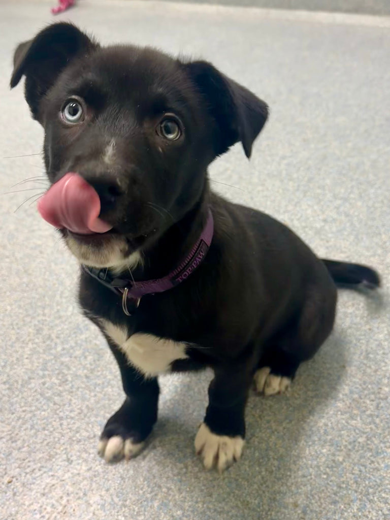 Huck is a 3-month-old Black Lab mix puppy. He is not yet neutered but will come with a voucher to do so.